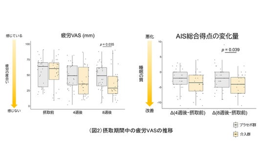 摂取前(ベースライン)、摂取4週後、摂取8週後の3回において、主観的疲労感を把握するVisual Analog Scale(疲労VAS)および主観的睡眠の質を問うアテネ不眠尺度(Athens Insomnia Scale:AIS)など、疲労や睡眠に関連する複数の主観的指標を測定しました。また、摂取前、摂取8週後の2回においては客観的指標(血液マーカーなど)等も併せて評価しました。