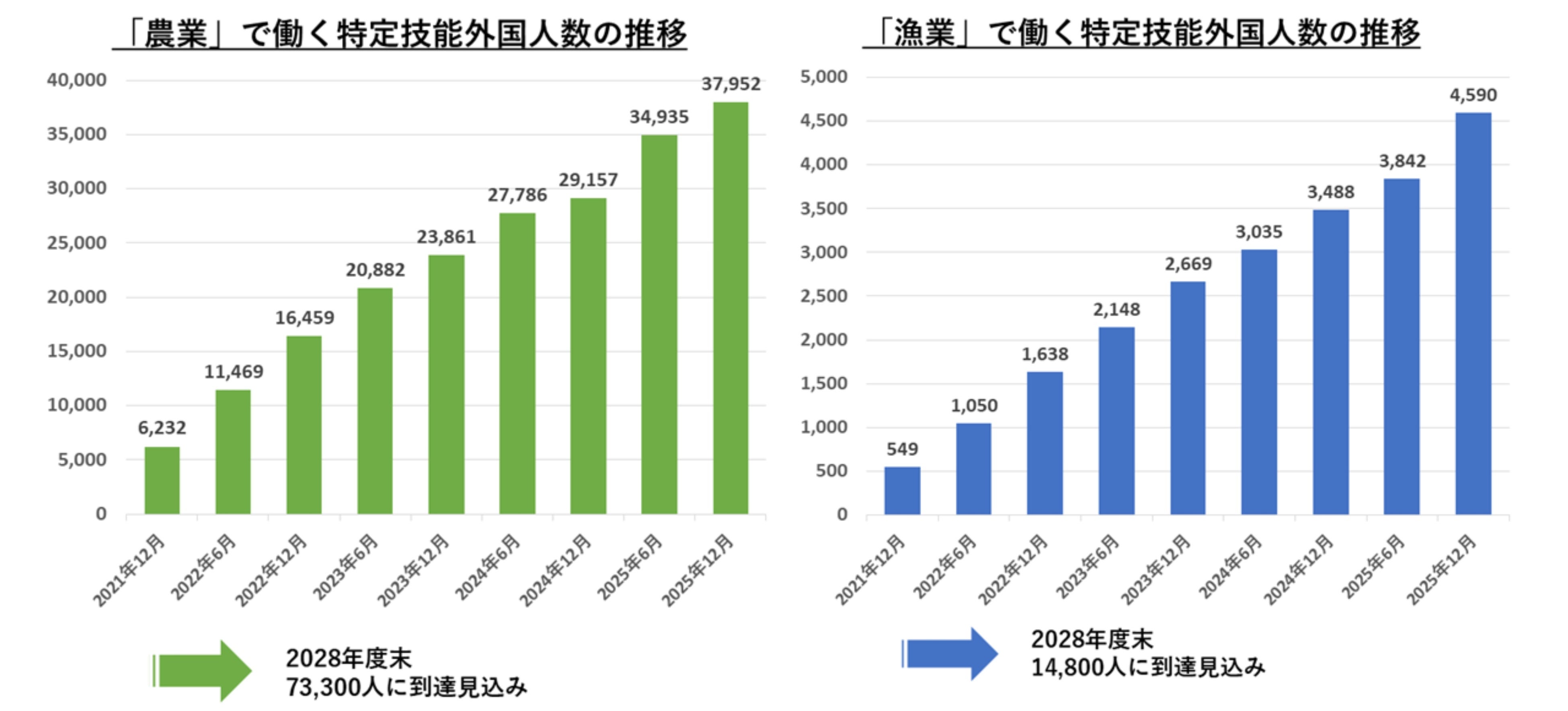 日本の農漁業においては人手不足と担い手の高齢化が急速に進んでおり、労働力の確保が極めて困難な状況にあります。季節変動や天候要因に左右されやすい一次産業では、繁忙期に必要な労働力を確保できず、生産量の維持が難しい地域が増加しています。こうした状況を受け、特定技能における「農業」「漁業」分野の需要も年々拡大し、技能実習から特定技能への移行も加速しています。政府統計では2028年度末までに農業分野で73,300人、漁業分野で14,800人の特定技能外国人材が必要とされています。