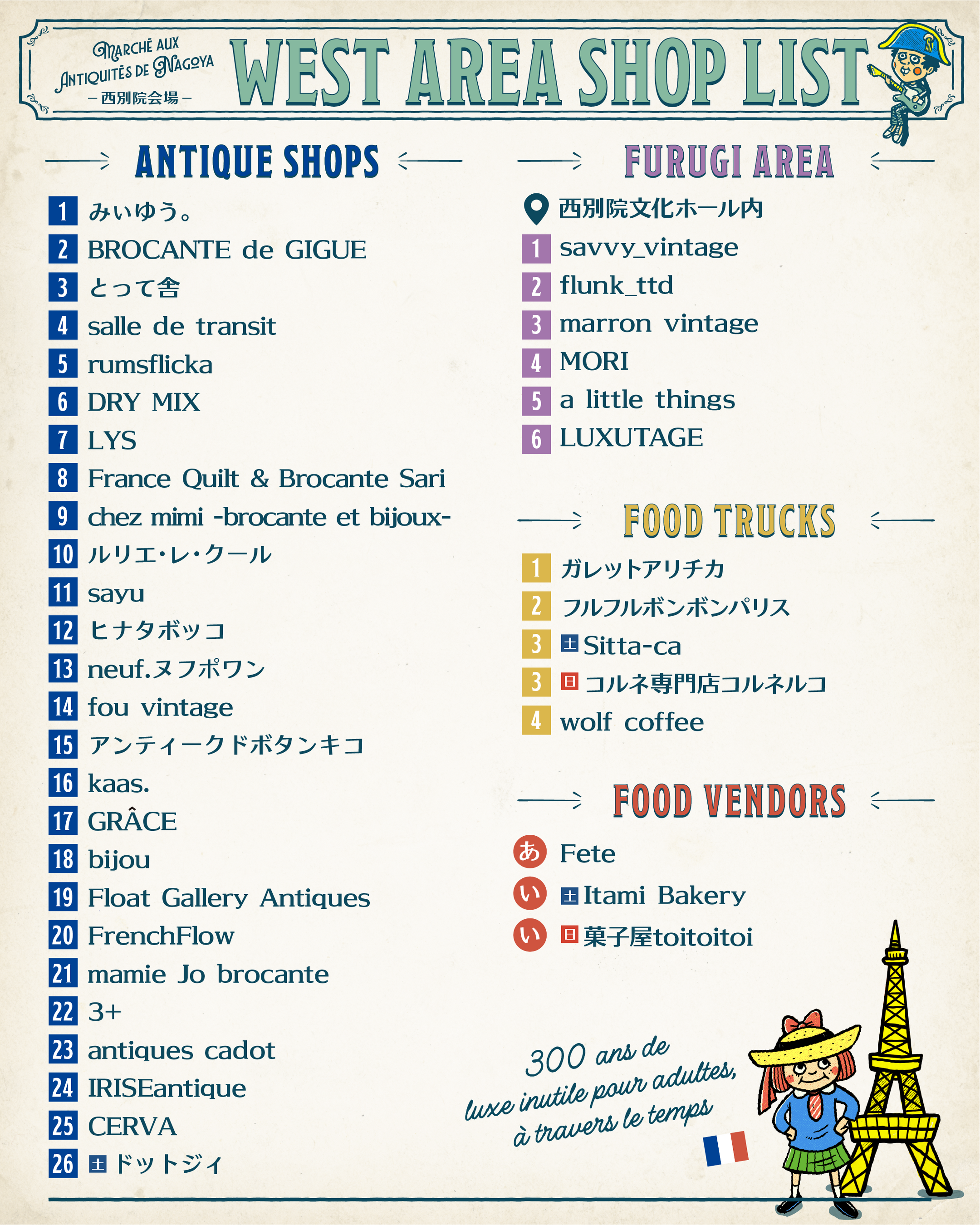1. 【WEST AREA:西別院】フランスの蚤の市を再現西別院会場は「フランス」をテーマに据え、会場全体をフランスの蚤の市に見立てて構成します。屋外には伝統的なアンティーク雑貨やブロカントだけでなく、ハイブランドのヴィンテージアイテムや革靴など、幅広いジャンルの名店が集積します。