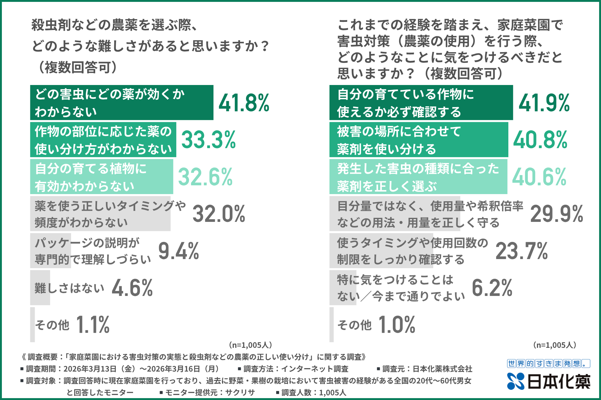 今回の調査から、家庭菜園における害虫対策の実態として、多くの方が手軽なスプレータイプの殺虫剤に頼る一方で、根本的な解決に至っていない課題が浮き彫りになりました。