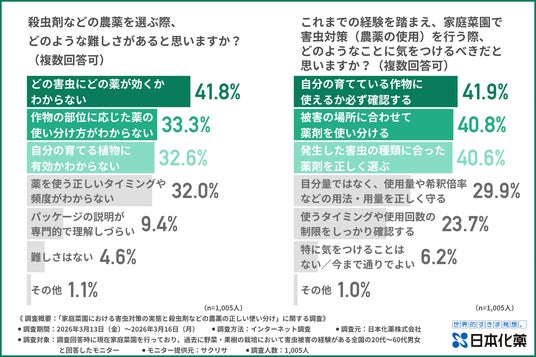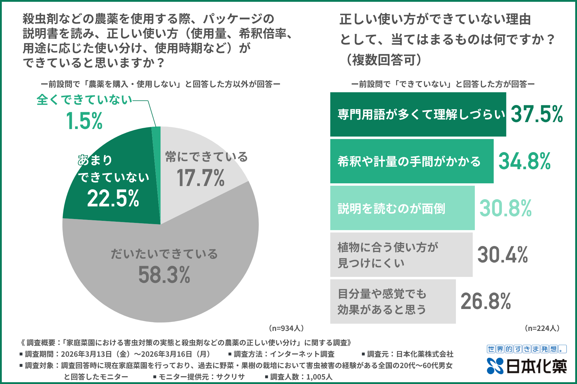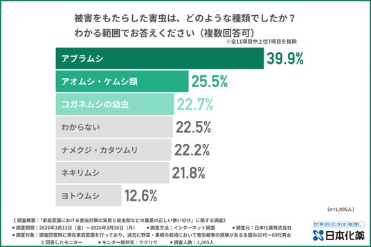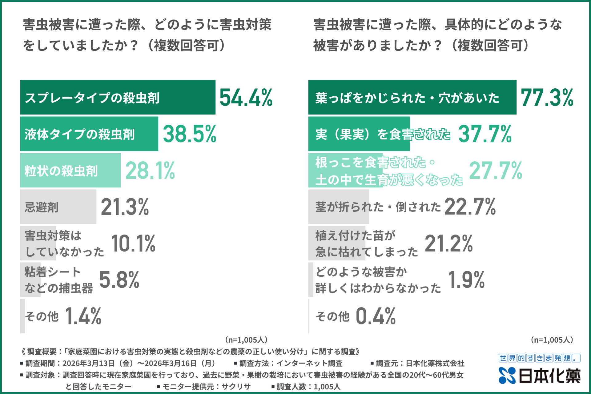 そこで今回、日本化薬株式会社 アグロ事業部(https://www.nipponkayaku.co.jp/agro/)は、現在家庭菜園を行っており、過去に野菜・果樹の栽培において害虫被害の経験がある方を対象に、「家庭菜園における害虫対策の実態と殺虫剤などの農薬の正しい使い分け」に関する調査を実施しました。