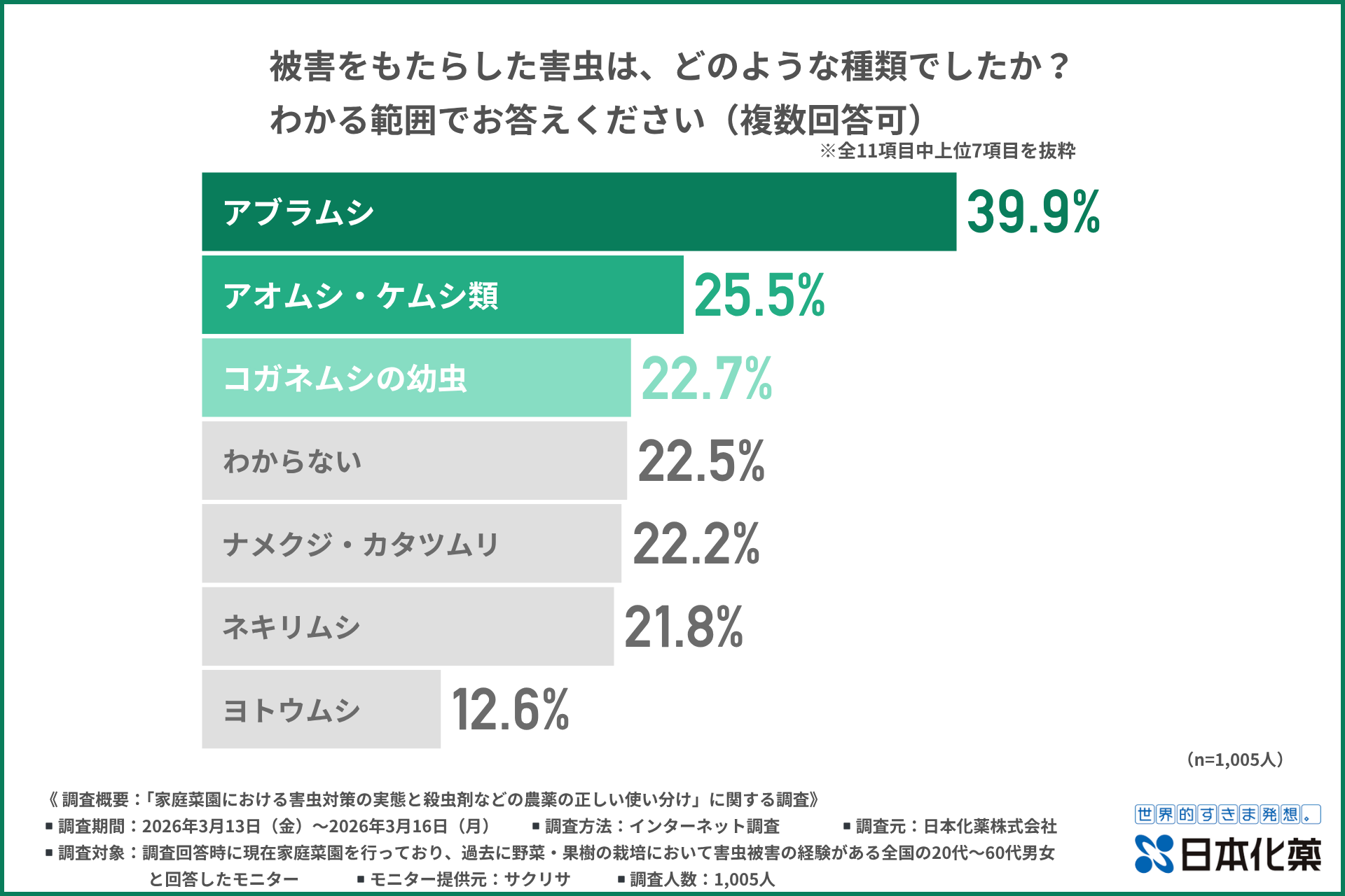 葉や茎に群生しやすいアブラムシやアオムシが上位に挙がっており、前問の「葉っぱをかじられた」という被害実態と一貫した結果となっています。