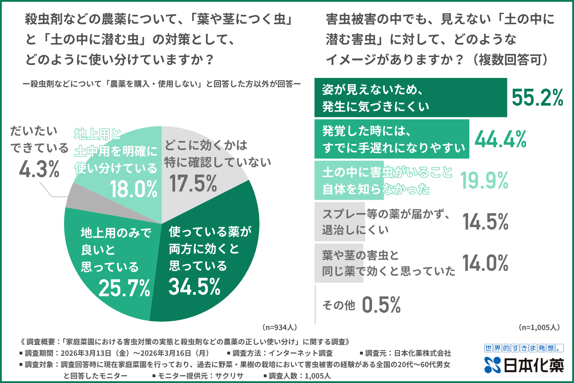 しかし、農薬の使い分けに関しては、使っている薬が地上と土中の両方に効くと思っている層が最も多く、明確に使い分けている人はわずか2割未満にとどまりました。
