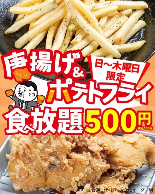 株式会社double(本社:大阪府大阪市北区/代表取締役:松井 勝也)が運営する“肉汁製作所 餃子のかっちゃん”では、 長引く物価高騰が続く中、お腹いっぱい食べて日頃の疲れを吹き飛ばしてほしいという想いを込めて、圧倒的なコストパフォーマンスを追求した「唐揚げ&ポテト食べ放題 500円」プランを開始しました。サクサクジューシーな自慢の唐揚げと、手が止まらなくなるフライドポテトの組み合わせはお酒のつまみとしてはもちろん、メインの食事としても大満足間違いなしの内容です。