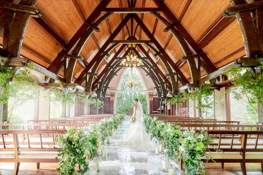 ・自然光と緑が満ちあふれる、天井高9mの木目調のチャペル
