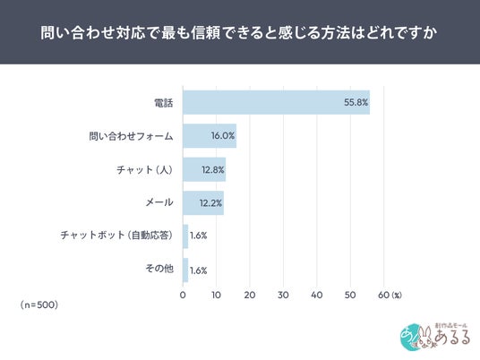 問い合わせ対応で最も信頼できると感じる方法としては、「電話」が55.8%で最多となりました。