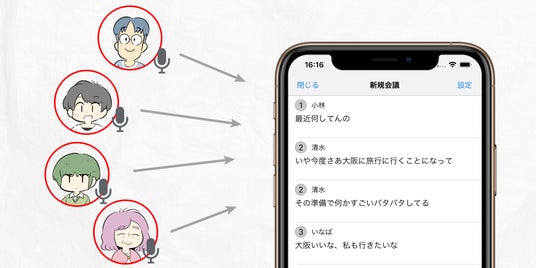 マイクを複数使用することで、最大9名の同時文字起こしに対応。発言が重なったり、会話の割り込みが発生してもすべての発言を文字起こしできるほか、マイクに名前を付けることで「誰が何を話したか」が一目でわかるデザインを実現しました。