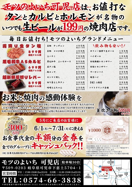 三重県を中心に展開し、連日行列の絶えない人気焼肉店「焼肉ホルモン モツのよいち」が、2026年4月25日(土)、ついに岐阜県へと初上陸いたします。可児市の新たな食の拠点として、最高品質の「商標登録 霜降り生タン」や「黒毛和牛A5カルビ」を、日常使いできる圧倒的な低価格でご提供いたします。