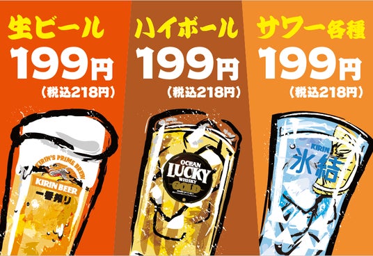 ■いつでも「生ビール・ハイボール・レモンサワー」が199円(税込218円)!