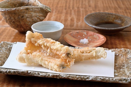旬の食材を丁寧に調理した天ぷらが評判の蕎麦屋、『浅草 ひら山』(東京・田原町)では、国産の春穴子をたっぷり味わえる。ふっくらサクッと揚げる人気の一品だ。