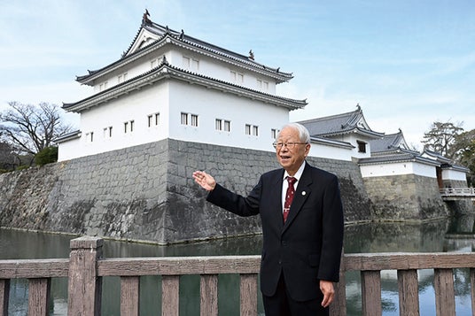 家康が将軍職を秀忠に譲った後に居城とした駿府城の巽櫓と、その右に連なる東御門。東御門は長屋状の櫓(多聞櫓)に囲まれた堅牢な入口(桝形虎口)となっている。写真は「家康は、この城で大坂方面からの敵を迎え撃ち、江戸を守る最後の砦にしようとしたのです」と解説する小和田哲男さん。