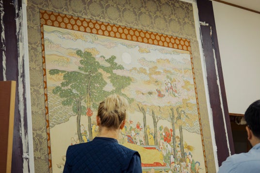 神宮の文化財を守る表具師の工房伊勢神宮の社殿から日本各地の寺社仏閣、美術館に至るまで、美術品の修復・保存技術は何世紀にもわたり文化財を守り続けてきました。伊勢の地で活動する3代目の表具師は、その技術の系譜を受け継ぐ匠のひとりです。工房では、繊細な掛軸や数百年を経た仏画が、伝統と革新を融合させた多層的な工程で蘇ります。工程ごとに異なる種類の和紙を使い分け、伊勢神宮の井戸から汲んだ御神水で10年以上かけて仕込んだ糊を用いるなど、純度と強度を極限まで追求した技法が用いられます。掛軸の裏打ちや糊付けなど、修復の一端を間近で見学しながら、日本の文化財保存の静かなる技に触れる工房訪問です。