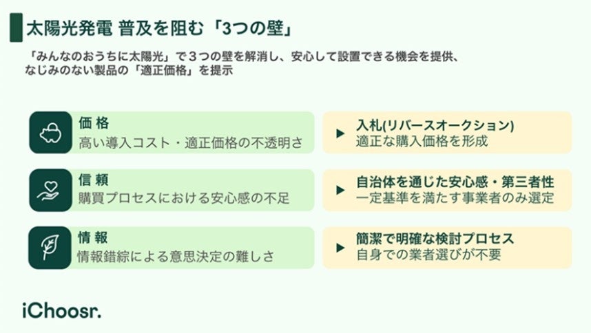 私たちが「共同購入事業」を通じて目指すのは、生活者が自ら納得して判断する「能動的な選択」の機会を提供することです。 まだ馴染みの薄い太陽光パネルや蓄電池を、「一部の先進的な選択」から「誰もが検討できる現実的な選択肢」へと定着させ、安心して手軽に導入できる環境づくりを重視しています。本事業では、普及を阻む「3つの壁」を解消することで、再生可能エネルギーのさらなる普及を支援してまいります。