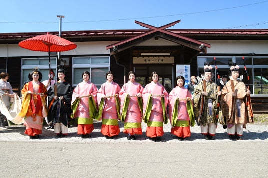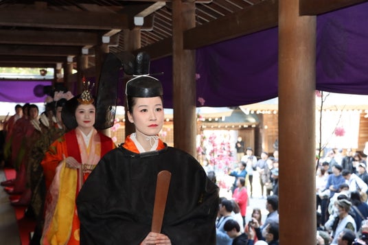 生きびなさまとして地域の女性9人が、后(きさき)や内裏(だいり)、官女などの役を務め、生きびな行列では神社周辺を練り歩き、多くの見物客を魅了しました。
