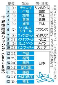英国の航空関連調査会社「スカイトラックス」が発表した2026年世界空港ランキングで、羽田空港は3位、成田空港は5位となり、アジアの空港がトップ5を占めた。羽田、成田は前年と同じ順位だったが、熊本、那覇といった地方の空港の順位は大幅に向上し、羽田、成田との差が縮まった。