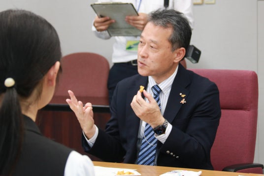 三重大生が考案した商品を実際に試食した一見三重県知事、森吉雇用経済部長、大坪雇用経済部次長からは「濃厚な伊勢海老の風味の後に、マイヤーレモンの香りがきいていて美味しいです。ベビースターとの商品名ですが、子どもだけでなく、大人のおつまみとしても良い味だと思います。」とのコメントをいただきました。さらに、三重大生代表2名に向けて「三重県での活躍を期待しています」とのコメントも頂戴しました。