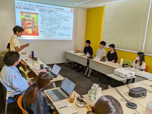 おやつカンパニーは、未来のモノづくりを担う次世代を育成するため、商品開発現場のリアルな就業体験に基づいたインターンシッププログラムを2025年夏よりスタートさせました。その1期生として、三重大学の生物資源学部の3年生9名(生物圏生命化学科生命機能化学教育コース所属)がインターンシップに参加しました。ただ“教える”のではなく、体験による学生自らの“気づき”を重視し、アイデア出しや試作検討などを経て、会議でのプレゼンテーションにて承認を得るまでの新商品開発プロセスを体験していただきました。
