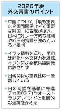 茂木敏充外相は10日の閣議で、主に2025年の外交、国際情勢をまとめた26年版外交青書を報告した。中国について25年版の「最も重要な2国間関係」から「重要な隣国」に表現を後退。高市早苗首相の台湾有事を巡る国会答弁で冷え込んだ日中関係を反映した形だ。首相が答弁した昨年11月以降「日本に対し、一方的な批判や威圧的措置を強めている」と批判した。緊迫化したイラン情勢の早期沈静化に向け、外交努力を続ける考えも示した。