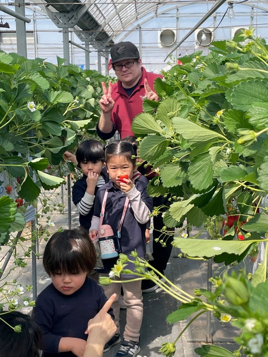 今回の遠足では、いちご農園での体験を通して、子どもたちの関係性に大きな変化が見られました。収穫したいちごを「あげるね」「甘いよ」と英語で声をかけながら一緒に遊びながら笑い合う様子や、年齢の低い子や講師にいちごを分け与える姿から、思いやりや友情が深まっていく様子が印象的でした。自然の中で過ごすことで、日常とは異なる開放的な環境が生まれ、言い合いや取り合いが起こることなく、子どもたちがのびのびと関わり合う姿も見られました。こうした体験は、単なる遠足ではなく、共感力や協働性といった非認知能力を育てる重要な教育機会となっています。