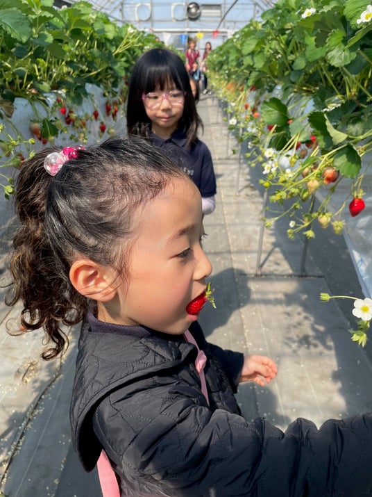 本農園では、水耕栽培によっていちごが育てられており、子どもたちはその仕組みにも興味を示していました。自分の手で収穫したいちごを味わい、友だちと分かち合いながら食べる体験は、「食」への関心を高める貴重な機会にもなります。「美味しいね!」「どうやって作っているのかな?」といった英語でのやり取りを通して、子どもたちは食べ物への興味や感謝の気持ちを自然と育んでいきました。