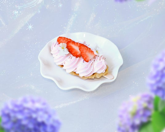 香ばしく焼き上げたクロッフルに、ホイップクリームとストロベリークリームを重ねたバイカラーが可愛らしい一皿。シンデレラに憧れたラビットをイメージしたバニラアイスに、ひらりと舞う蝶々のチョコレートが、幻想的な庭園の世界観を演出します。さらに、オリジナルジュレマカロンも添え、見た目も味わいも楽しめる華やかなプレートに仕上げました。物語の中に迷い込んだような、ときめきあふれるクロッフルプレートです。