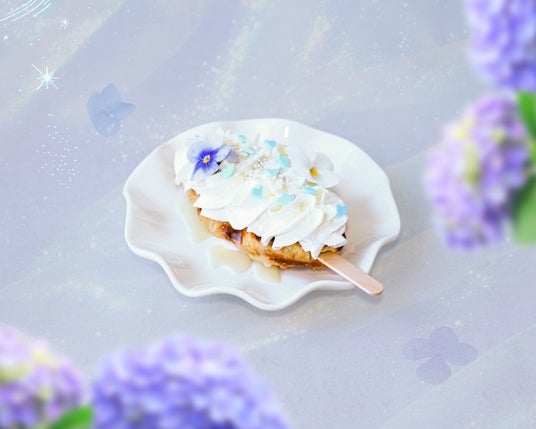 香ばしく焼き上げたクロッフルに、ふんわり軽やかな生クリームをたっぷり。細かく砕いたホワイトチョコを重ね、やさしい甘さと軽やかな食感をプラス。ブルーハートシュガーとアラザンを散りばめ、ひと口ごとにシャリっと弾けるきらめきを演出しました。まるでシンデレラの魔法を閉じ込めたような、