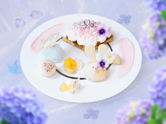 あじさいカラーをイメージしたピンクと水色のバイカラーが美しいラムネシロップのゼリー、そして蝶々のチョコレートを添えたなめらかなチーズケーキ、イチゴをあしらったワッフルタルトなど、幻想的で可憐なスイーツがティースタンドを彩ります。さらに、ジャムが隠し味のオリジナル“ジュレマカロン”もセットに。物語の世界に迷い込んだかのような、ときめきあふれるシーズン限定のスペシャルなアフタヌーンティーをぜひお楽しみください。