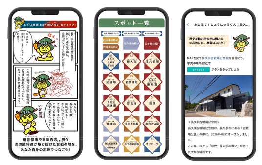 また、事前学習コンテンツ「長久手合戦ガイド」では、岩崎城の戦い、白山林の戦い、桧ヶ根の戦い、仏ヶ根の戦いといった合戦の流れをわかりやすく整理し、登場武将や史実の背景を事前に学べます。スポット一覧画面では、関連する戦ごとに色分けされた表示により、気になる戦に絞って巡ることも可能です。史跡が広範囲に点在する長久手市においても、アプリ上で現在地を確認しながら、史実での合戦の流れに沿って巡れるよう工夫しています。