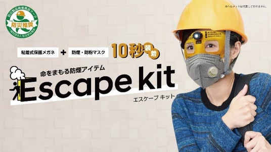 エスケープキットは、サッと素早く装着できる粘着式保護メガネと手軽でありながら高性能な防煙・防粉マスクが一つのパッケージに同梱されており、目と呼吸器を保護しながら、安全な避難をサポートします。
