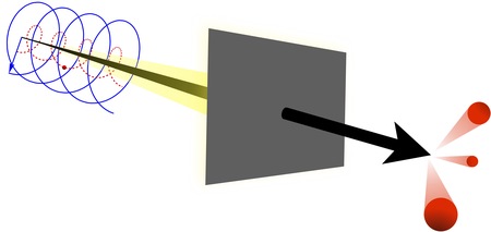 図1 提案する実験のイメージ図。青い螺旋はアンジュレータ中の磁場、赤い点線は加速された電子の軌跡を表す。電子の加速運動により放射光(黄色)とダークフォトン(黒)が生成される。ダークフォトンは遮蔽壁を透過して検出器に到達し、内部で電子の雪崩現象(赤)を引き起こす。