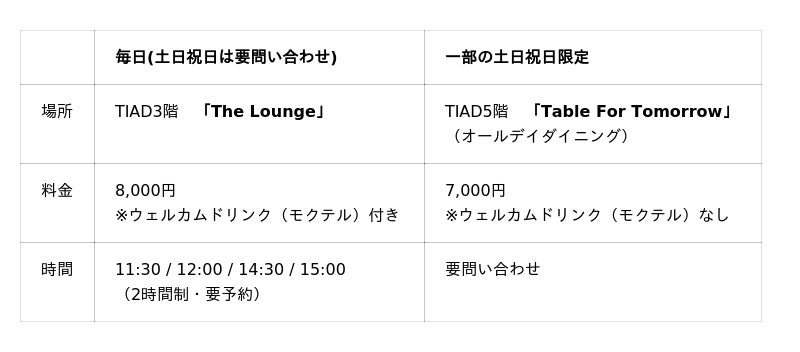 「Table For Tomorrow」(TIAD5階、オールデイダイニング)にて提供いたします。