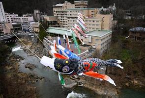 札幌市南区の定山渓温泉で10日、こどもの日を前に「渓流鯉のぼり」が始まった。大小約400匹のこいのぼりが温泉街を中心に公園や足湯、神社に飾られ、雪の残る渓谷に春の訪れを告げた。