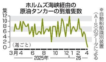 ペルシャ湾からホルムズ海峡を抜け、日本に到着する原油タンカーが直近の1週間(4〜10日)で0隻となり、途絶状態となった。共同通信による自動船舶識別装置(AIS)のデータ分析で分かった。海峡が事実上封鎖された影響が出た。封鎖前の1年間の週間平均は7隻程度。海峡の通航が再開しても日本まで数週間かかる。国内の原油不足は当面続きそうだ。