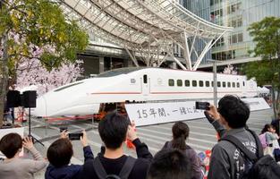 同社の古宮洋二社長はつばめを前に「九州各地の方々に元気をもらった。世界一幸せな車両だ」と笑顔を見せた。熊本出身のアーティストらによって桜の木が描かれた車体が照らし出されると、集まった観客から大きな拍手が上がった。