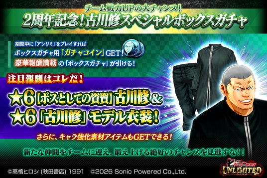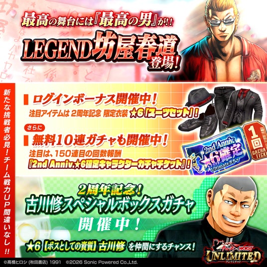 チーム戦力UPの大チャンス『ログインボーナス / 無料10連ガチャ』 & 『スペシャルボックスガチャ』 では ★6【ボスとしての資質】古川修 を仲間にするチャンス─など見逃せない要素満載!