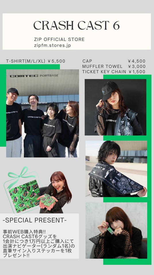 Tシャツ、キャップ、マフラータオルはZIP-FM ナビゲーターの永田レイナがデザインを担当。事前WEB購入特典として、「舞台:CRASH CAST6」オフィシャルグッズを1会計につき1万円以上ご購入にて出演ナビゲーター(ランダム1名)の直筆サイン入りステッカーをプレゼントします。
