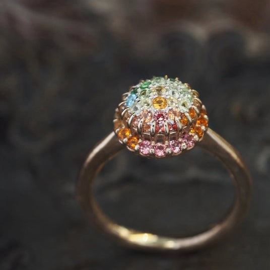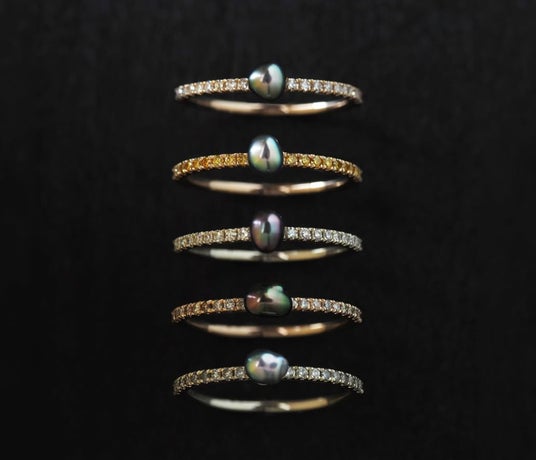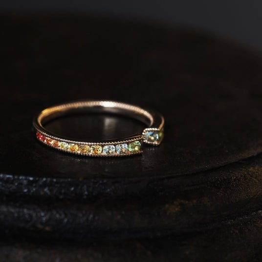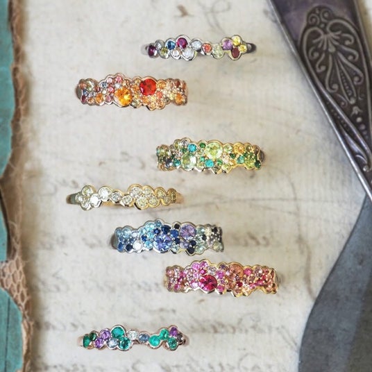 極小の爪でカラーストーンやダイヤモンドを隙間なく留めたパヴェリングは、光が指先を流れるような輝きと、立体感ある表情が魅力です。