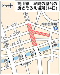 春の高山祭、祭り屋台の曳きそろえ場所変更 14日に開幕 レジャー 社会 2026年4月12日 05:00 協力金を納めた人に渡す祭礼の次第書=高山市城山、日枝神社 春の高山祭(日枝神社例祭)が14、15日に高山市中心市街地で開かれる。今年は、見どころの一つでもある豪華絢爛(けんらん)な祭り屋台の曳(ひ)きそろえ場所が変わるなどの変更点がある。... 全文:350文字 この記事をお読みいただくには「デジタルプラン」または「宅配+デジタルプラン」の会員登録が必要です。無料会員の方はログインしてマイページからコース変更してください。デジタルプランまたは宅配+デジタルプランをご登録中の方はログインしてください。 岐阜新聞デジタル会員に登録すると 無料会員向け記事が読める ニュースレターで最新情報が受け取れる デジタルプラン、宅配+デジタルプランなら Webオリジナルコンテンツが読める 紙面ビューアが読める チケットの先行発売に参加できる お得なクーポンが使える 新規登録ページ ログインページ トップ 岐阜のニュース レジャー 春の高山祭、祭り屋台の曳きそろえ場所変更 14日に開幕 関連記事 窯元巡りや蔵出し市にぎわう 多治見市市之倉で「陶の里フェスティバル」 花鳥や静物画、繊細タッチ 岐阜市出身の日本画家・向井さんが個展 野麦峠、女工哀史を描いた「強さ」 飛騨市出身の画家・故沖野清さんの作品、高山で展示 花みこし、うだつの上がる町並み彩る 「美濃まつり」が美濃市中心部で開幕 三番叟、来年は新曲で奉納 春の高山祭からくり屋台 「国宝」の舞踊家・谷口さん制作 御嶽山の国定公園指定 江崎知事、誘客へ「価値高まる」 環境相と面会 おすすめ記事 郡上市のスキー場、入場100万人を維持 競技人口減少する中、幅広いニーズに対応 降り注ぐ火の粉、みこし勇壮に 岐阜市で「手力の火祭」 国道工事現場、のり面が崩落 恵那市の新丸山ダム整備 窯元巡りや蔵出し市にぎわう 多治見市市之倉で「陶の里フェスティバル」