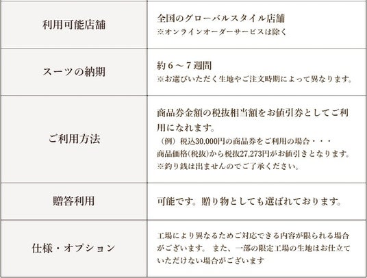 グローバルスタイルのオーダースーツ商品券は多くの方にご好評いただいております。全国のグローバルスタイルの店舗でご利用いただけます。