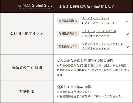 オーダースーツ専門店「グローバルスタイル」を運営するグローバルスタイル株式会社(東京証券取引所 スタンダード市場:7126、本社:大阪市中央区、代表取締役社長 田城弘志)が、鳥取市のふるさと納税返礼品として取り扱う「オーダースーツ商品券」の有効期限を変更しました。