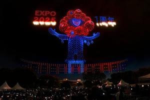 大阪・関西万博が昨年4月に開幕してから1周年を記念したイベントが12日、大阪府吹田市の万博記念公園で開かれ、公式キャラクター「ミャクミャク」などを夜空に描くドローンショーが披露された。