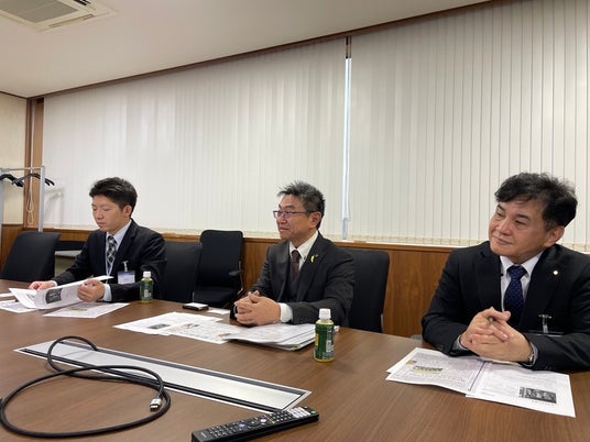 米蔵家 代表取締役 山本様(中央)、知立市商工会 事務局長 早川様(右)、経営指導員 田中様(左)から受賞のご報告(FUJI本社にて)
