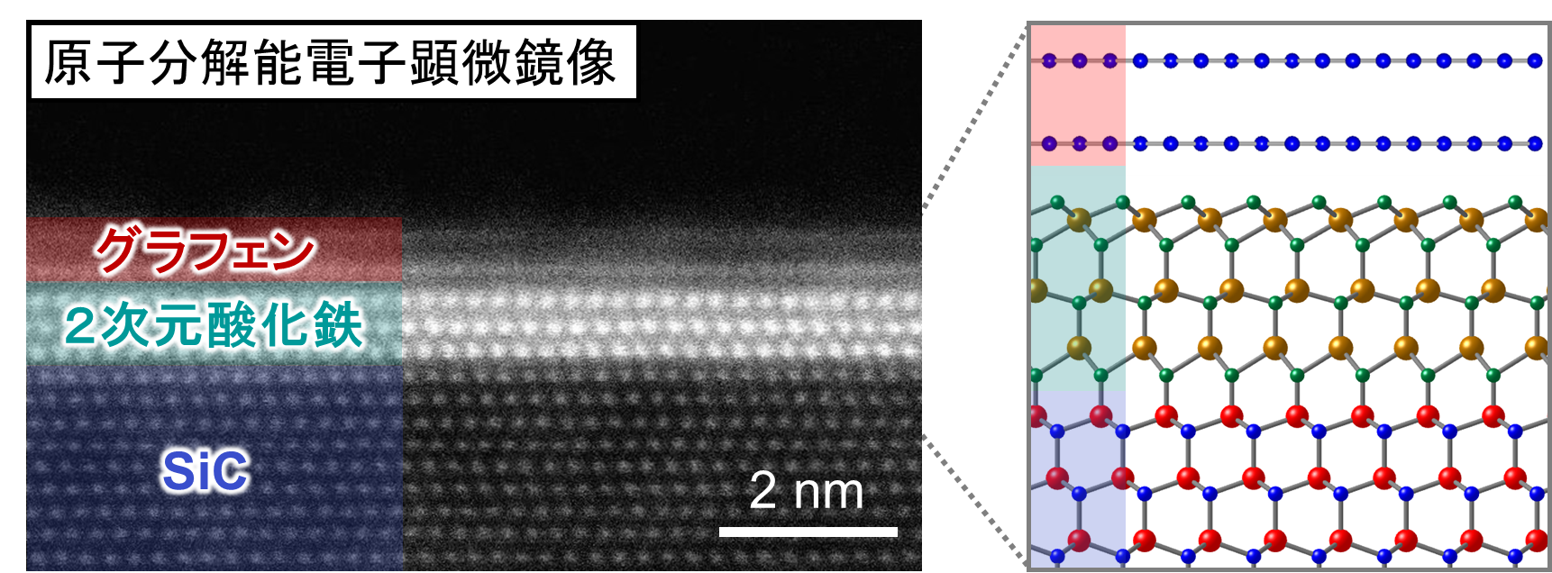 本研究により、2次元物質であるグラフェンと3次元物質であるSiCとの界面において、自然界には存在しない構造を持つ2次元酸化鉄を作製できることが明らかになり、また、メスバウアー分光測定により、この2次元酸化鉄は冷却に伴って常磁性から反強磁性への磁気相転移を示すことが示唆されました。これらの結果は、スピントロニクスや低次元磁性などへの応用が期待されます。