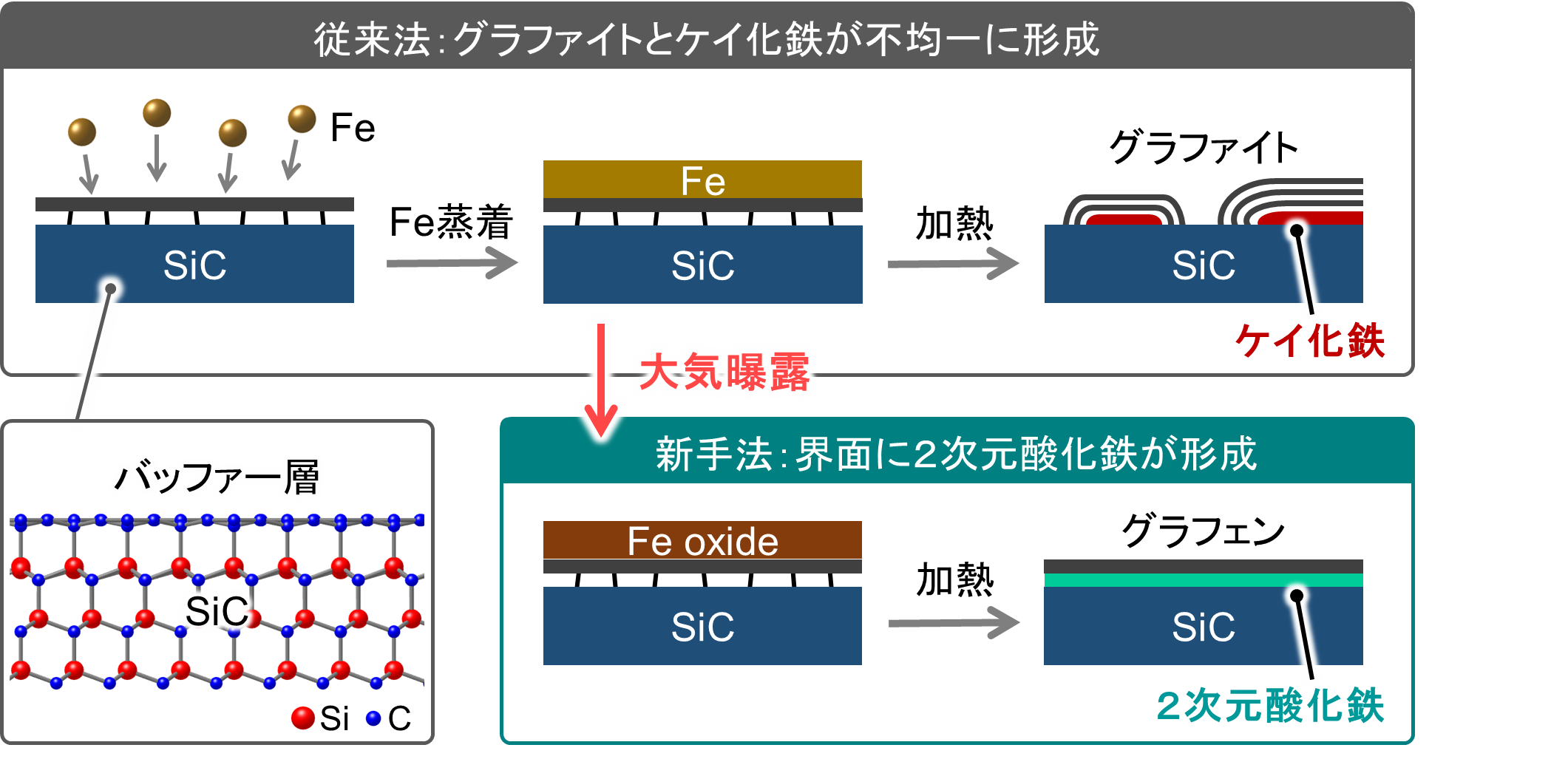 様々な物質をグラフェン/SiC界面にインターカレーションする際、まずグラフェンとほとんど同じ構造を持つバッファー層と呼ばれる炭素原子層をSiC上に形成します。従来では、このバッファー層上に真空中で元素を堆積させ、そのまま加熱するというアプローチがとられてきました。これは、加熱中に酸素が存在すると、グラフェン/SiC界面に酸素が優先的にインターカレーションしたり、グラフェン中の炭素と反応してCO2として分解されるためグラフェンがなくなってしまうためです。しかしながら、この手法を鉄に適用した場合、鉄が炭素やケイ素と優先的に反応して、グラファイトやケイ化物が不均一に形成されてしまいます(図1)。