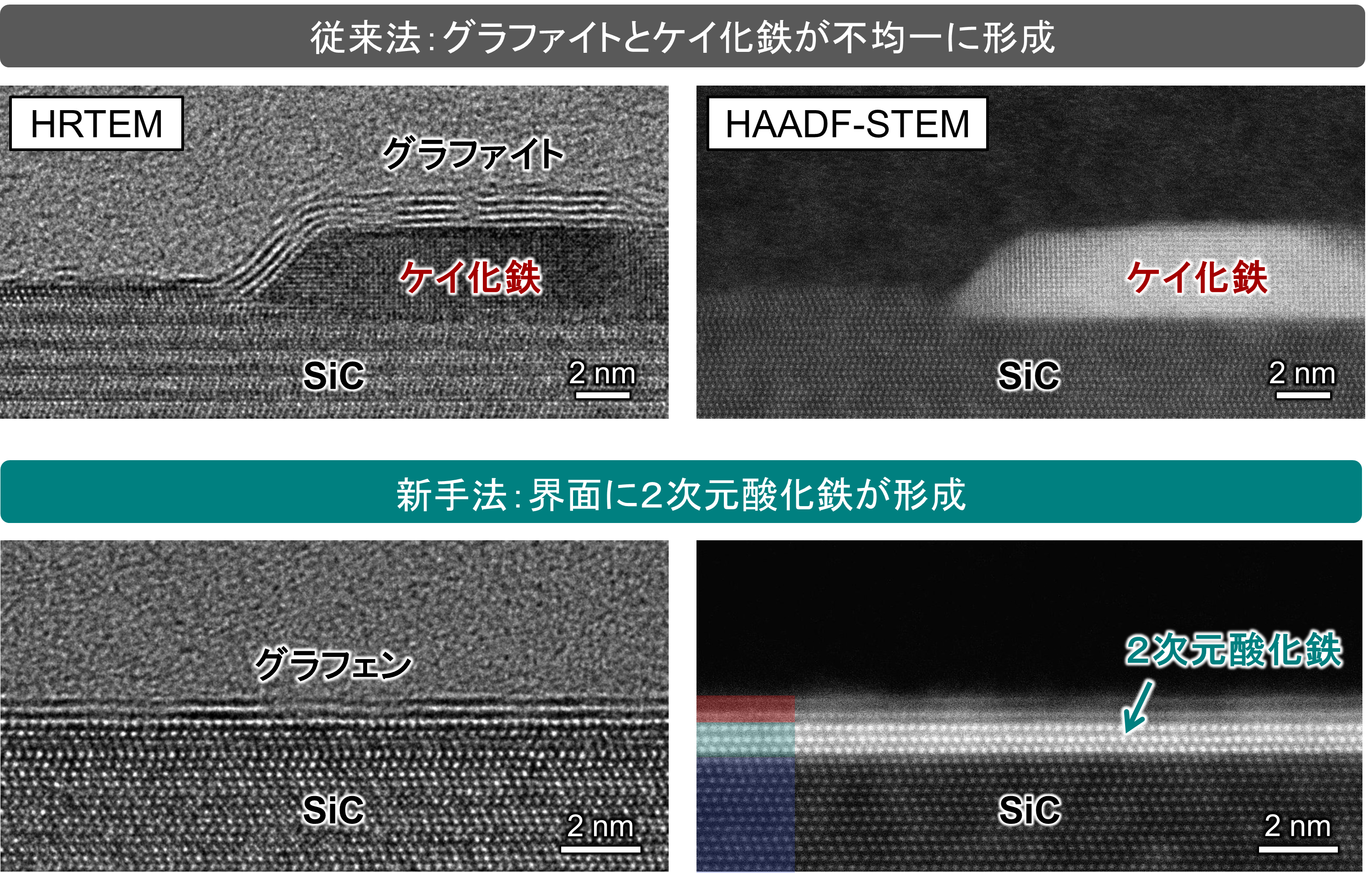 これらの、従来法と新手法で得られた試料断面の原子分解能電子顕微鏡像を図2に示します。従来法では、鉄がSiCと反応することにより多層グラフェンとケイ化鉄(Fe silicide)が不均一に形成されました。一方、新手法で作製した試料の高角環状暗視野走査透過型電子顕微鏡(HAADF-STEM)像では、グラフェンとSiCの界面に、矢印で示すような一様な輝点の周期配列が見られました。HAADF-STEM像では、原子番号の大きい元素ほど明るく観察されます。この界面の輝点領域において電子エネルギー損失分光による元素分析を行った結果、そこには鉄と酸素が含まれていることから、グラフェンとSiCの界面に酸化鉄の2次元結晶が形成されたことがわかりました 。
