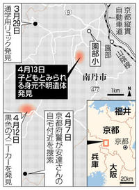 京都の山林、子ども?遺体 不明男児との関連捜査 2026年4月14日 05:00 身元不明の遺体が見つかった京都府南丹市の現場付近を出る警察車両。後部座席がブルーシートで覆われていた=13日午後9時23分 13日午後4時45分ごろ、京都府... 残り1201文字(全文:1218文字) この記事をお読みいただくには「デジタルプラン」または「宅配+デジタルプラン」の会員登録が必要です。無料会員の方はログインしてマイページからコース変更してください。デジタルプランまたは宅配+デジタルプランをご登録中の方はログインしてください。 岐阜新聞デジタル会員に登録すると 無料会員向け記事が読める ニュースレターで最新情報が受け取れる デジタルプラン、宅配+デジタルプランなら Webオリジナルコンテンツが読める 紙面ビューアが読める チケットの先行発売に参加できる お得なクーポンが使える 新規登録ページ ログインページ トップ 岐阜のニュース 京都の山林、子ども?遺体 不明男児との関連捜査 関連記事 段ボールアート、童話の世界 笠松町で作品展 人手不足の対応策「働きやすい環境整備」が最多 休日増や残業時間を削減 岐阜県内企業、人手「足りない」8割 岐阜新聞社アンケート 下呂市小坂町でハナモモの花見頃 遊歩道を彩る 福島正則の書状、関ケ原古戦場記念館で公開 「猪武者」は何に気配り 白川町と東白川村の全路線を廃止へ 濃飛バス、来年3月末 おすすめ記事 岐阜県で今週末どこ行こう?【4月18、19日】 飲食店従業員に迷惑行為 多治見市職員、懲戒処分 可児市の国道41号、バイクの男性死亡 乗用車と衝突 岐阜県内企業、人手「足りない」8割 岐阜新聞社アンケート
