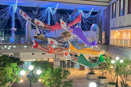 館内1階モール広場では、高さ20mの吹き抜け空間を活用した最大10m、総数41流の鯉のぼり展示がスタートしました。本展示は、ホテルスタッフが約4日間をかけて設営し、一つひとつ高さや角度を細かく調整することで、空中を泳ぐような立体的な演出を実現しています。本来は屋外で楽しむ季節行事を屋内で体験できる点が特徴であり、天候や混雑に左右されず間近で鑑賞できる“逆説的な体験価値”を創出しています。地域から寄贈された鯉のぼりを活用することで、地域文化の継承と再活用にもつながる展示として展開しています。