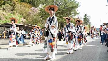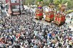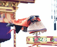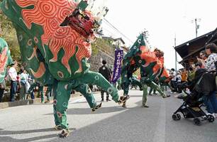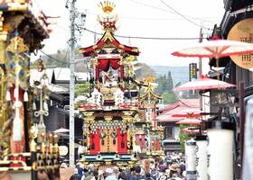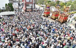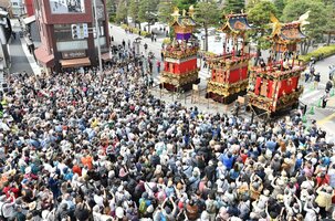 午前10時ごろ、御旅所前で祭り屋台3台のからくり奉納が始まると、妙技を一目見ようと大勢の観光客が...