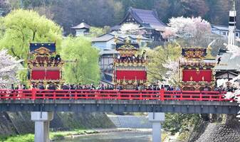 高山市中心市街地で14日、春の高山祭(日枝神社例祭)が開幕した。桜の花びらが舞う中、豪華絢爛(けんらん)な祭り屋台が蔵から出され、春の高山を華やかに彩った。