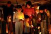 益城町では45人が亡くなった。親族を亡くした学童支援員中山美香さん(46)は子どもと手を合わせ「布団の上で安らかに眠ってほしかった」と話した。夜には町民らが約650本の竹灯籠に火をともした。